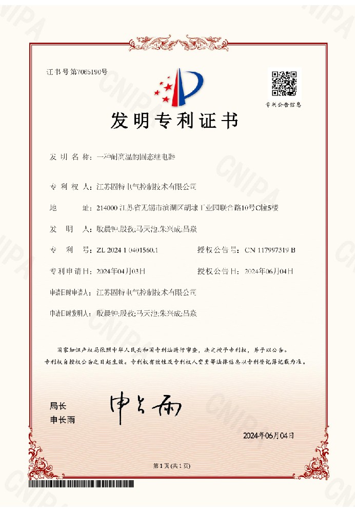 國家高新技術(shù)企業(yè),固態(tài)繼電器行業(yè)先驅(qū)者和行標(biāo)制定者。成立33年來各項專利累計超100余項。目前有效專利81個,包含多項發(fā)明專利、實用新型、外觀專利等